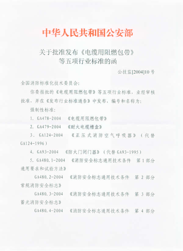 关于批准发布《电缆用阻燃包带》等五项行业标准的函