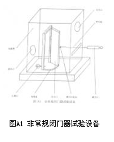 6.3 最大关闭时间不大于20s;最小关闭不小于3s。关闭速度不可调的闭门器,其关闭时间应介于6±3s之间。 6.4 门扇复位偏差不大于0.15°。 6.5 有定位功能的闭门器,必须能在规定的位置或区域实现定位,并易于脱开。 6.6 6.1~6.5中如有任意一项或一项以上不符合要求,该闭门器即为不合格。 7 试验报告 试验报告应包括下列内容: a、 委托单位名称; b、 生产单位名称; c、 样品名称及型号; d、 样品生产日期及试验日期; e、 试验依据; f、 试验数据; g、 观察记录; h、 试验结果; i、 试验单位及负责人。 附 录 A 非常规闭门器试验设备(补充件) A1 非常规闭门器试验设备,由防火门、刻度盘、测力计挂钩、测力计、位移计、保温罩、牵引线等组成,见图A1。 A1.1 防火门。门扇尺寸b×h,mm:450×1000。通过配重,门扇重量可达到40、60、80、100kg,以适应被测闭门器的规格。门扇可根据被测闭门器的安装情况配作。门扇通过插装式合页与门框相连。 A1.2 刻度盘。用金属材料制成的刻度盘安装在门扇下部,在门扇厚度的中心线上有一指针,指针对着刻度盘。 A1.3 测力计挂钩。挂钩位于距门扇下边缘高1000mm,距门轴转动中心880mm处。 A1.4 测力计。测力计实测负载应相当于测力计量程的20%~80%。 A1.5 位移计采用机械式百分表。百分表的测头与全关闭后的门扇垂直接触,接触点距门轴转动中心400mm。 A1.6 保温罩正面采用耐热透明材料,以便观察被观测闭门器试验期间有无破损、变形现象以及位移计的读数。保温罩上设有进、出风口。保温罩正面与门扇上测力计挂钩等高处开一槽孔。 A1.7 牵引线。牵引线采用φ1~φ1.2mm钢铰线。牵引线一端固定在测力计挂钩上,穿过保温罩上的槽孔,另一端与测力计相连。 A1.8 风机、风道、加热器、测控温仪表。试验时,风道与保温罩进风口相连。 A1.8 热电偶。热电偶丝直径0.75~1.0mm。