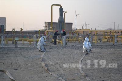 为贯彻落实总队《关于做好输油、输气管道灭火救援准备工作的通知》的安排部署,全面了解和掌握辖区主要油气管道的布设路线,输送及储存油、气的类型、数量和理化性质等情况,切实做好辖区消防安全工作,坚决遏制重特大火灾发生,提高官兵的实战能力。1月3日下午,吐鲁番地区鄯善县大队联合鄯善县安洁燃气有限公司民用气调配中心举行燃气管道灭火救援实战演习,鄯善消防大队25名官兵参加演练。